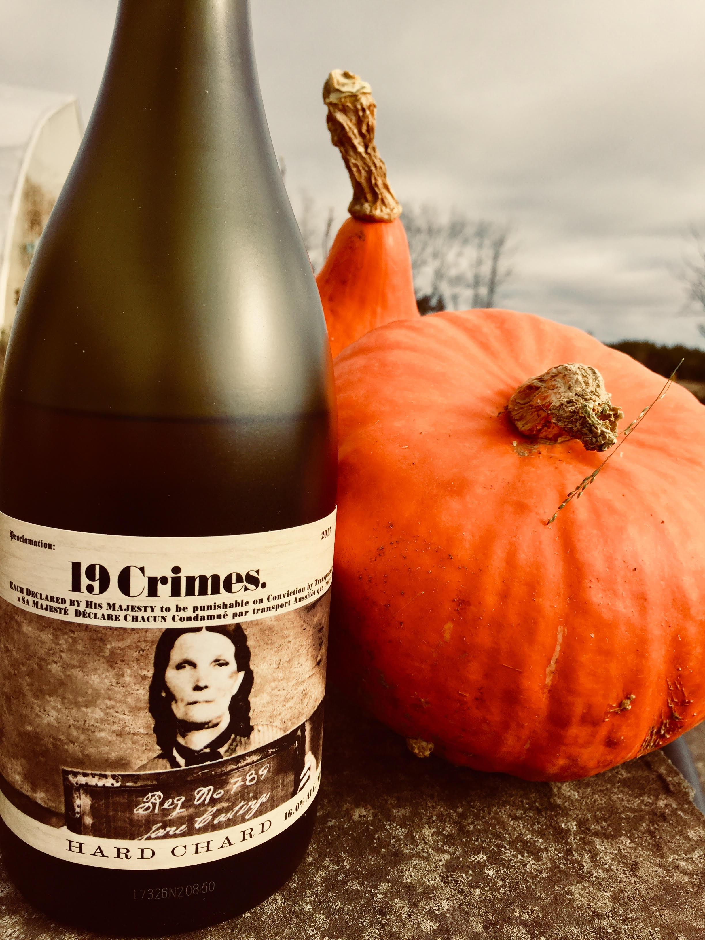 19 Crimes Hard Chardonnay White Wine (Jane Castings) 19 Crimes Hard Chardonnay White Wine (Jane Castings). Story behind the label: Jane Castings was caught and convicted for receiving stolen goods of cheese and bacon in Leicester, England. She trained and paid a group of teenage boys to steal the goods that she requested.