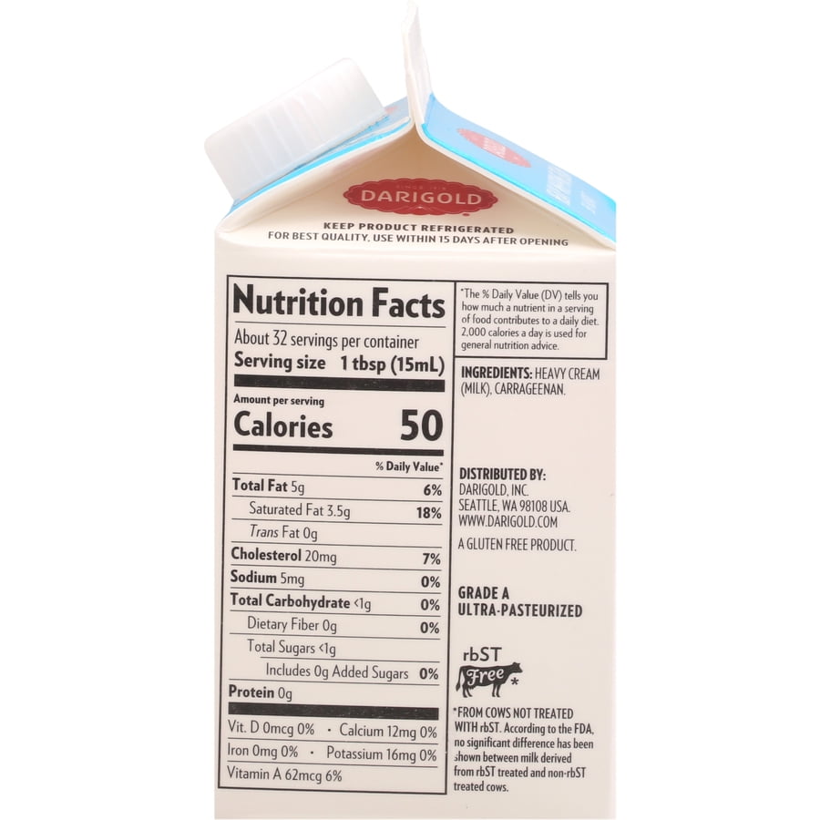 Heavy Cream 101: Nutrition Facts and Health Effects Heavy Cream Provides Calcium Heavy cream contains calcium, a mineral that plays an important role in skeletal health. In addition, calcium is essential for the muscular and central nervous system and, among many other functions, it helps to stimulate muscle contraction ( 10 ). How Many Carbs in Heavy Cream? (+Diet Control) Heavy cream is clearly full of fat. But there are other vitamins and minerals as well. For instance, if you look at a 119-gram serving, you will find the following: A calorie count of 350 to 400 (estimated) 3-grams of protein along with 43 grams of fat Only 3-grams of carb content The vitamin A count is around 30% or more with a 4% choline count Cream, heavy nutrition facts and analysis. Cream, half and half. Cream, flavored, half and half. Cream, heavy contains 816 calories per 240 g serving. This serving contains 87 g of fat, 6.8 g of protein and 6.8 g of carbohydrate. The latter is 7 g sugar and 0 g of dietary fiber, the rest is complex carbohydrate. Cream, heavy contains 55 g of saturated fat and 271 mg of cholesterol per ...