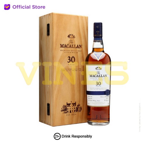 Macallan 30 year old Whisky - Blue Box - The Surrey Wine Cellar Description A famous old expression of The Macallan 30 year old. Matured entirely in sherry oak casks. This was the last edition of the sherried 30yo before the introduction of the Fine Oak series, and also the last 30yo before Macallan revamped their bottle shape and packaging, ditching the wooden boxes for 25yo and 30yo.