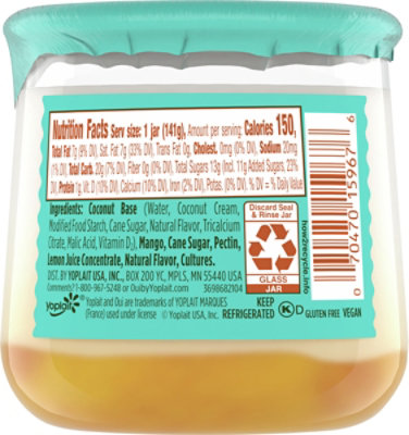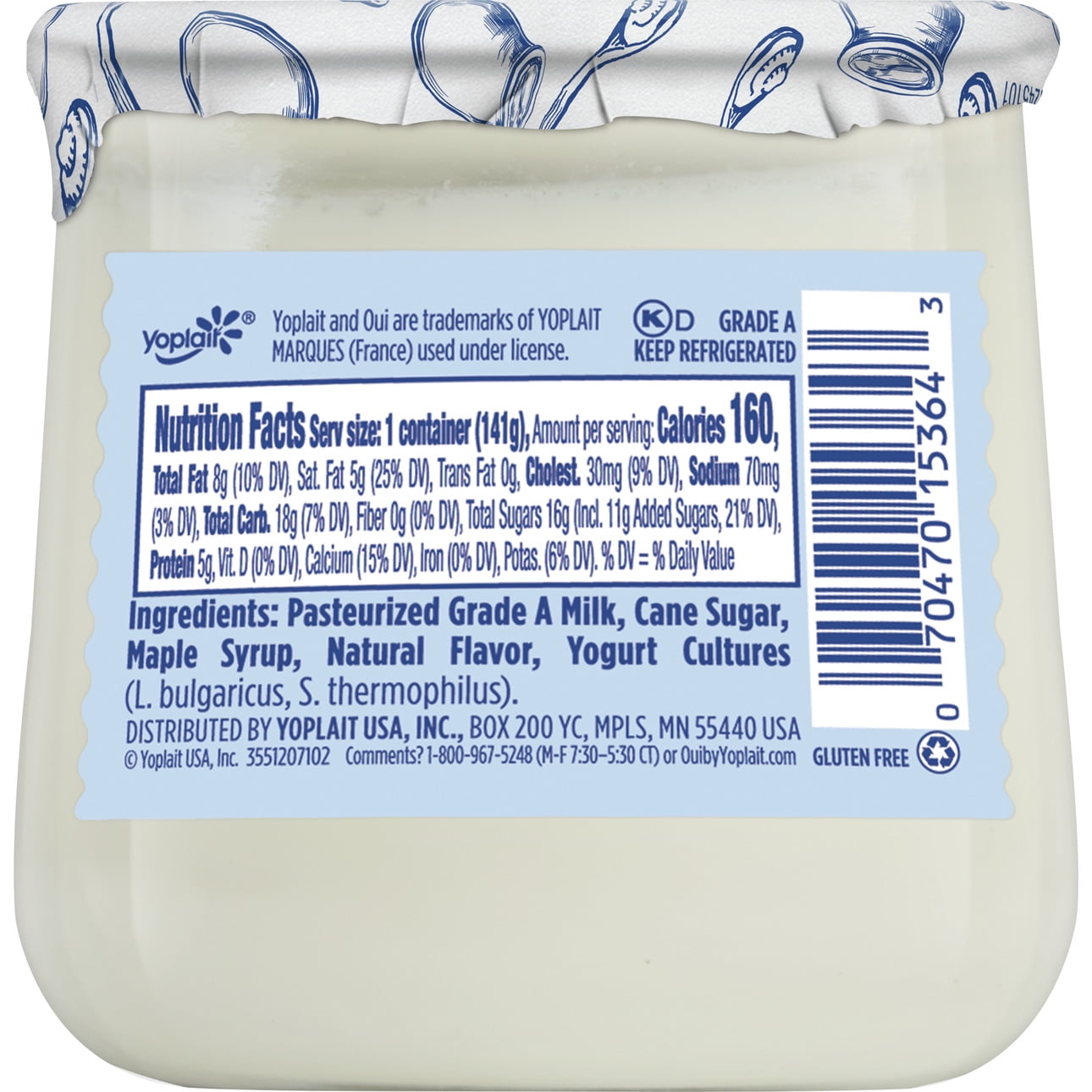 Nutrition Facts for Yoplait Oui Coffee Yogurt • MyFoodDiary® Oui Coffee Yogurt. Nutrition Facts. Serving Size. container. 1 container = 141g. Amount Per Serving. 160. Calories % Daily Value* 12%. Total Fat 8g. 25% Saturated Fat 5g ... Burn 160 Calories. 29.4 minutes Walking at 17 min/mile. 150-pound adult. No incline or extra weight carried. Burn 160 Calories. 24.1 minutes Weight training. Nutrition Facts for Yoplait Oui Vanilla Yogurt • MyFoodDiary® Oui Vanilla Yogurt Nutrition Facts Serving Size container 1 container = 141g Amount Per Serving 170 Calories % Daily Value* 12% Total Fat 8g 30% Saturated Fat 6g Trans Fat 0g 10% Cholesterol 30mg 3% Sodium 75mg 6% Total Carbohydrate 17g 0% Dietary Fiber 0g Total Sugars 15g 18% Includes 9g Added Sugars Protein 5g 0% Vitamin D 0mcg 16% Calcium 210mg What is Oui dairy free yogurt made of? Is Oui yogurt healthy? With around 130 calories, 5g saturated fat, and only 6g of natural sugars per serving, Oui is the perfect option for a healthy snack or breakfast. What are the ingredients in dairy free yogurt? That's because of the differences in the main ingredient used to make yogurt. Oui Yogurt, French Style, Blueberry: Calories, Nutrition Analysis ... For women: 100 calories (25 grams, 6 tsp per day) For men: 150 calories (37 grams, 9 tsp per day) The FDA is more "generous", the Daily Value for added sugars is 200 calories (50 grams, 12 tsp per day). Here at Fooducate, we suggest sticking to the stricter option (only 25 grams per day for women, 37 grams for men). More info