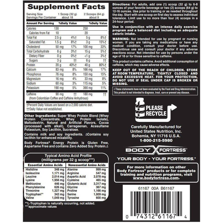 Body Fortress Whey Protein Powder, 60g Protein and 12g BCAA's (per 2 ... Body Fortress Super Advanced Whey Protein Powder is the ideal post workout protein supplement, featuring 100% premium Whey enhanced with Creatine and other critical amino acids. This gluten free protein powder formula gives you the power to train harder and rebuild lean muscle faster, because tomorrow's workout starts with today's recovery.