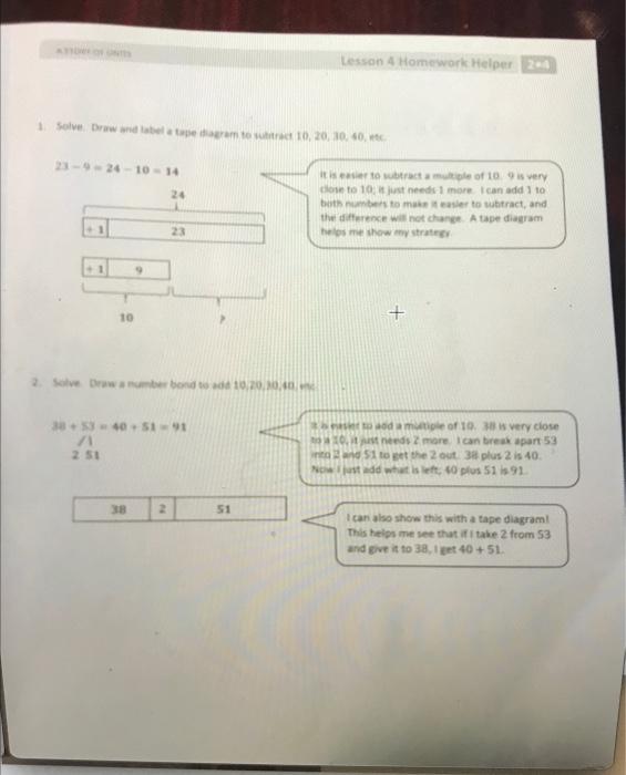 PDF Eureka Math Homework Helper 2015-2016 Grade 2 Module 4 1. Solve. Draw and label a tape diagram to subtract 10, 20, 30, 40, etc. 2. Solve. Draw a number bond to add 10,20,30,40, etc. 38 + 53 = 𝟐𝟐𝟏𝟏+ 𝟓𝟓𝟏𝟏= 𝟗𝟗𝟏𝟏 / \ 𝟐𝟐 𝟓𝟓𝟏𝟏 I can also show this with a tape diagram! This helps me see that if I take 2 from 53 and give it to 38, I get 40 + 51.