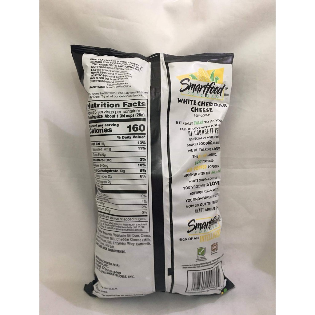 Smartfood Popcorn, White Cheddar Cheese: Calories, Nutrition Analysis ... Nutrition Serving Size: 1 oz (28g about 1 3/4 cups) Amount per Serving My Daily Value Calories 160 Kcal 9% Total Fat 10 g 16% Saturated Fat 2 g 12% Trans Fat 0 g 0% Cholesterol 5 mg 2% Sodium 290 mg 13% Total Carbohydrate 14 g 6% Dietary Fiber 2 g 8% Sugars 2 g 3% Added Sugars 2 g 8% Protein 3 g 6% Vitamin A 0 mcg 0% Vitamin C 0 mg 0%