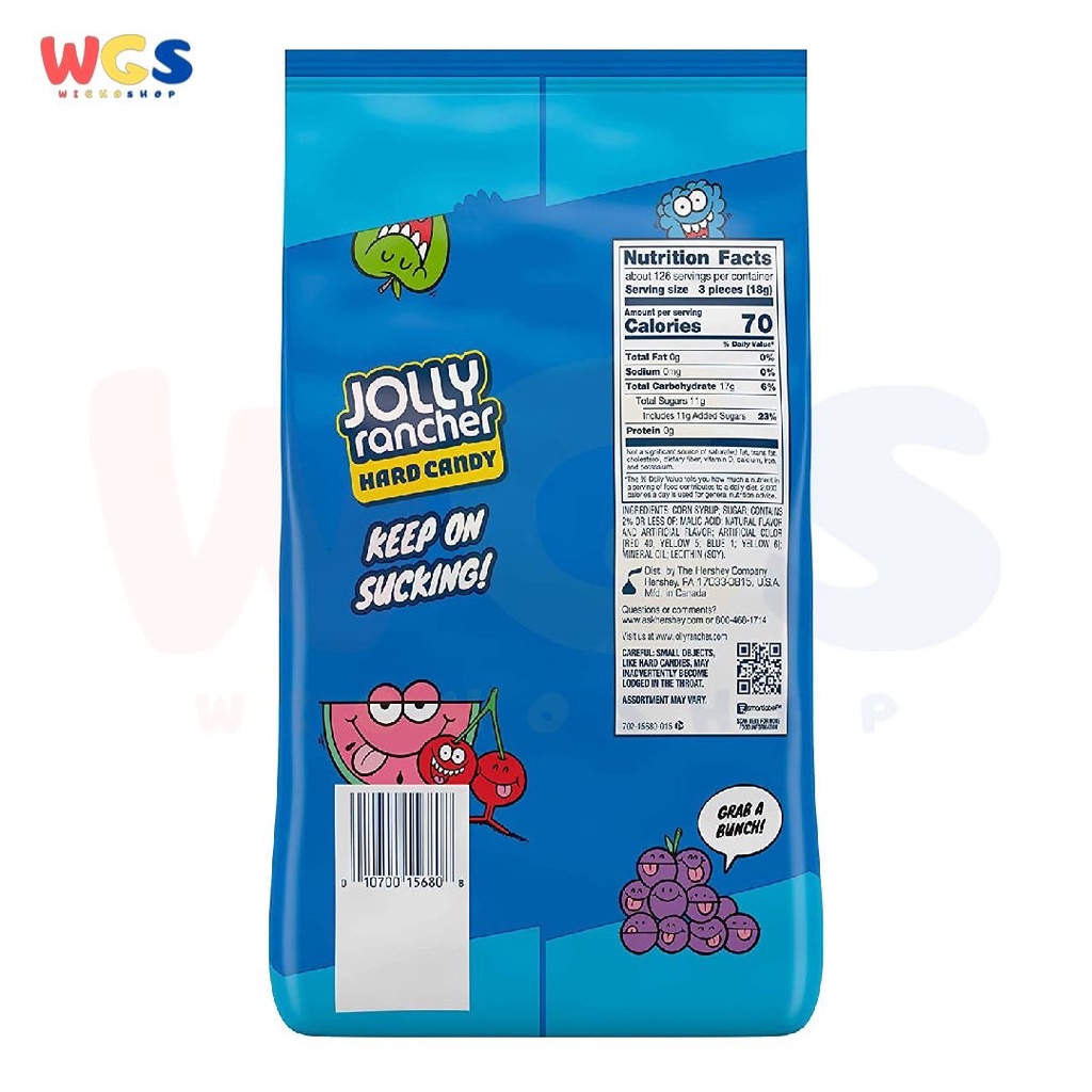 Nutrition Label - Allergen Inside Jolly Rancher Hard Candy Watermelon Contains 160 pieces of jolly rancher watermelonEvery piece is individually wrapped and freshness guaranteedFree from fat and sodium, UPC Code 010700100870 Manufactured by Hershey Co. ... Nutrition Label. Nutrition Facts. Serving Size 3.00 pieces. Amount Per Serving. Calories 70 Calories from Fat 0 % Daily ...