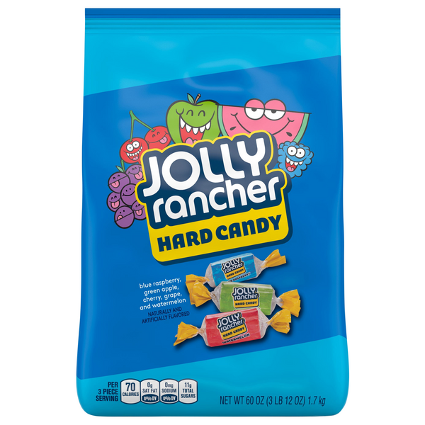 JOLLY RANCHER Original Flavors Hard Candy, 7 oz bag - Hersheyland JOLLY RANCHER Nutrition Information Nutrition Facts Servings Per Container about 11 Serving size 3 pieces (18g) Amount per serving Calories 70 % Daily Value* Total Fat 0g 0% Saturated Fat 0g 0% Trans Fat 0g Cholesterol 0mg 0% Sodium 0mg 0% Total Carbohydrates 17g 6% Dietary Fiber 0g 0% Total Sugars 11g Includes 11g Added Sugar 23%