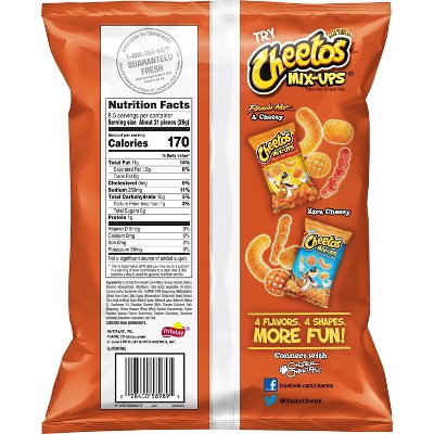 Hot Cheetos Nutritional Facts | livestrong Each serving of Hot Cheetos offers 2 grams of protein. Although there is no daily value percentage established for protein, the FDA suggests most adults should aim for at least 50 grams of protein each day. Hot Cheetos also has 15 grams of total carbohydrates in every serving, which is about 5 percent of the daily value. Home | Cheetos We are remixing your favorite flavors of CHEETOS® Mac 'n Cheese in a chef-curated dinner happening in Atlanta, GA! You and a guest could have the opportunity to dine with @cheatdayeats @chefkolbykash @onestopchop_. To enter, comment on THIS post using the hashtag #CheetosPassTheMacSweepstakes for a chance to win! NO PURCHASE NECESSARY. Products | Cheetos Find your favorite CHEETOS® snacks and discover hot, spicy new flavors. Cheetos Crunchy Flamin' Hot Cheese Flavored Snacks, 8.5 Ounce Product details. Product Dimensions : 11.36 x 2.21 x 7.38 inches; 8.5 Ounces. Item model number : 028400589895. UPC : 028400589895. Manufacturer : Frito Lay. ASIN : B019KE3616. Best Sellers Rank: #53,315 in Grocery & Gourmet Food ( See Top 100 in Grocery & Gourmet Food) #149 in Puffed Snacks.