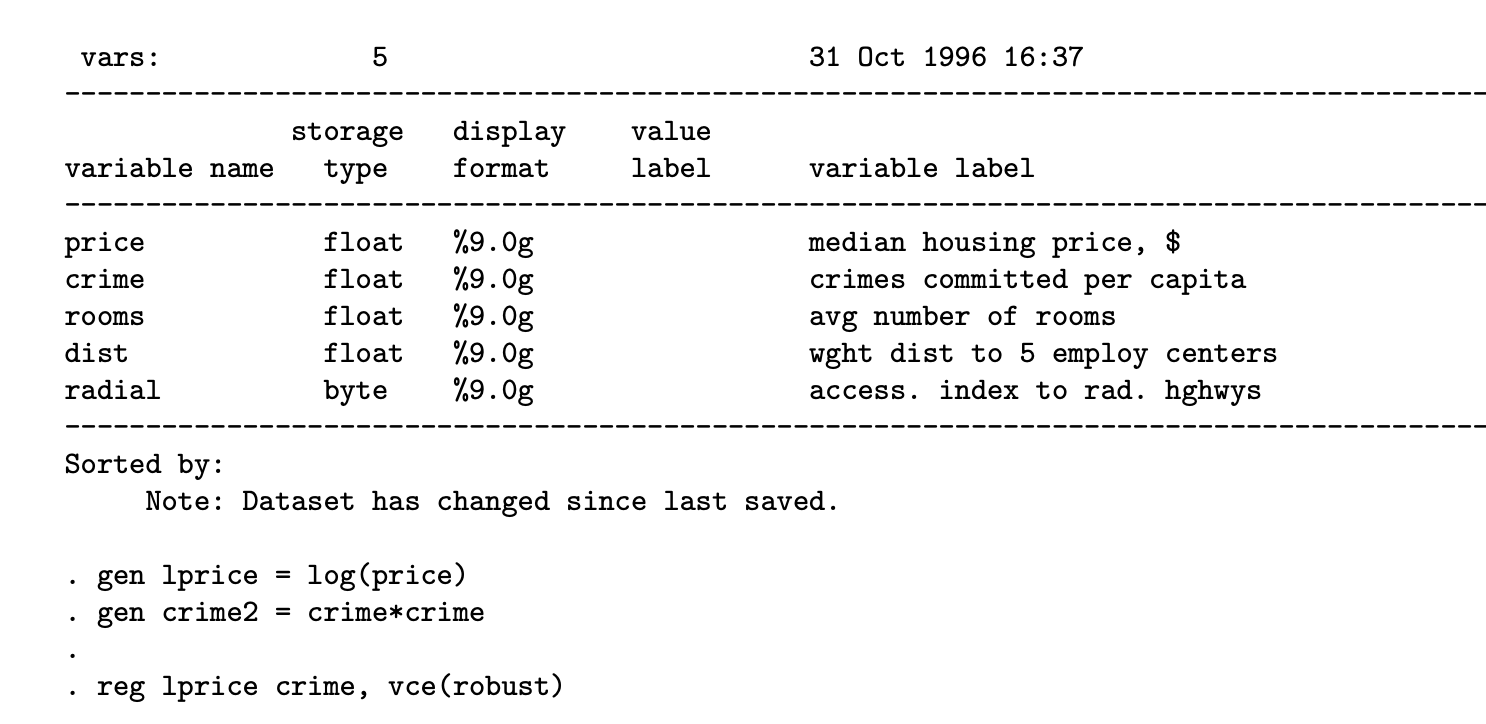 Variable Labels - Guides Stata variables have both names and labels. Variable names are the name that Stata uses to define a column. Variables labels are added information that can ... output using variable label rather than variable name - Statalist Nov 7, 2018 ... Are there some ways (options) that can let stata display variable labels rather than variable name, especially in the regression results. st: RE: Display Variable Labels - Stata ... "Nick Cox" . To, . Subject, st: RE: Display Variable Labels. Date, Thu, 27 May 2010 17:00:11 +0100 ...