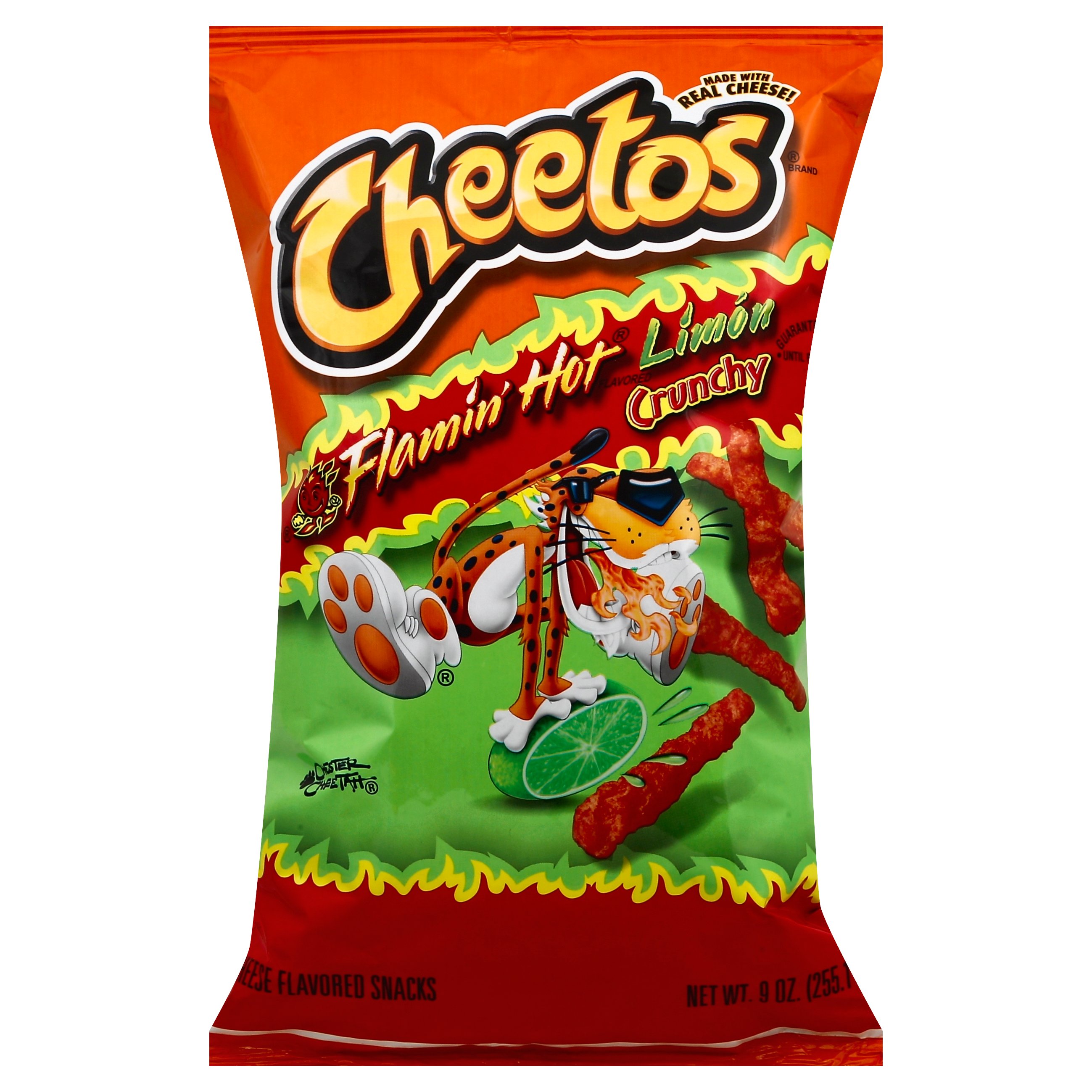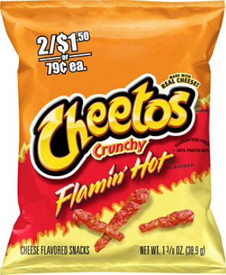 Cheetos puffs flamin' hot cheese flavored snacks 8.5 ounce plastic ... Cheetos puffs flamin' hot cheese flavored snacks 8.5 ounce plastic bag by Frito Lay contains 150 calories per 28 g serving. This serving contains 10 g of fat, 1 ... Crunchy - Flamin Hot (Large Bag) Calories, Carbs & Nutrition Facts 1710 Cal ; Fat48 g. 19/67g ; Sodium1850 mg. 450/2300mg ; Cholesterol295 mg. 5/300mg ... Flamin' Hot Cheetos Crunchy Nutrition Facts - Eat This Much Frito-Lay, Inc. ; For a Serving Size of 1 oz (28.35g) ; How many calories are in Flamin' Hot Cheetos Crunchy? Amount of calories in Flamin' Hot Cheetos Crunchy: ...
